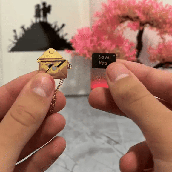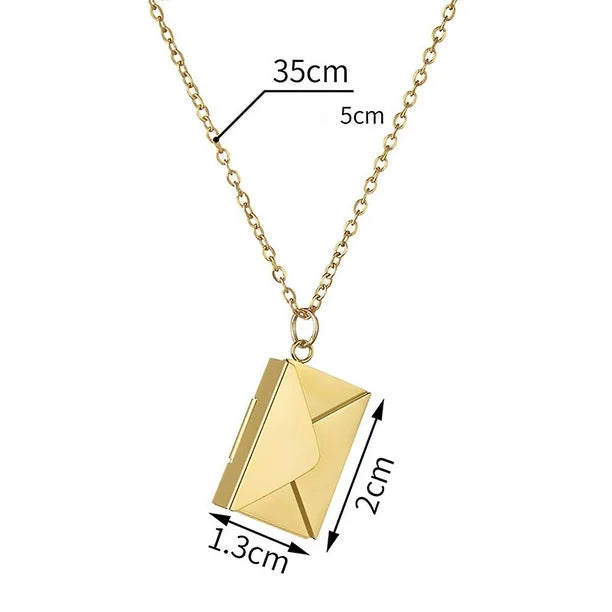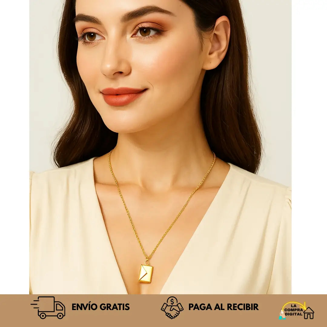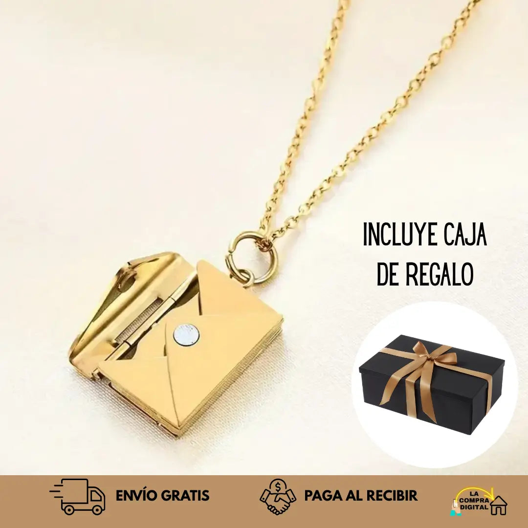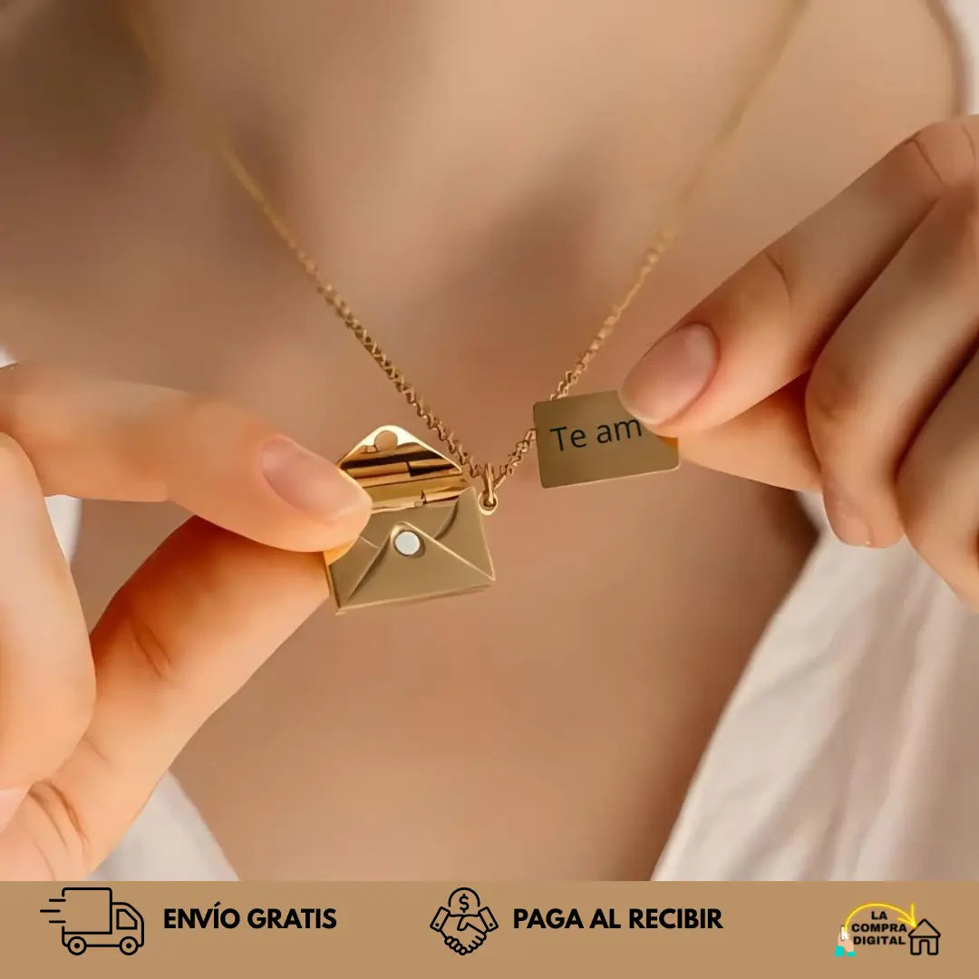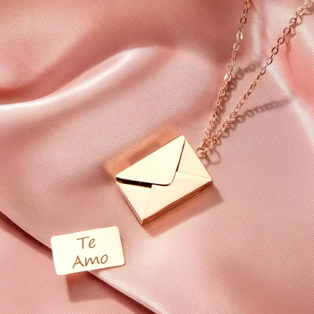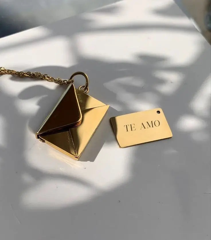 Este Collar Carta de Amor es diferente: un sobre dorado que guarda el mensaje más sincero Te amo. Hecho en oropel y acero inoxidable.