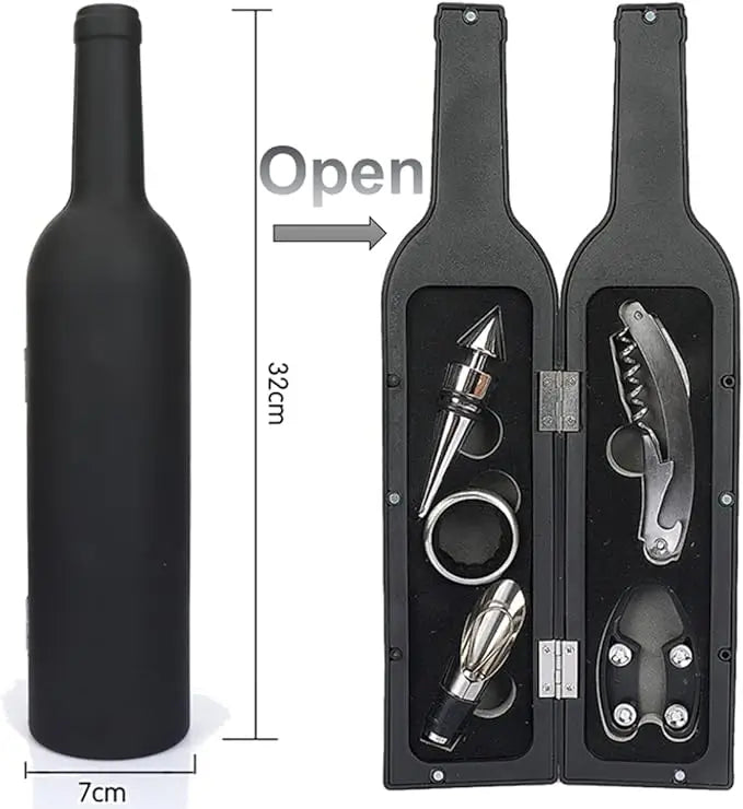 Desde la apertura hasta el almacenamiento, este set cubre todas tus necesidades. Incluye 5 piezas que serán muy útiles. Todo en una elegante caja con forma de botella.